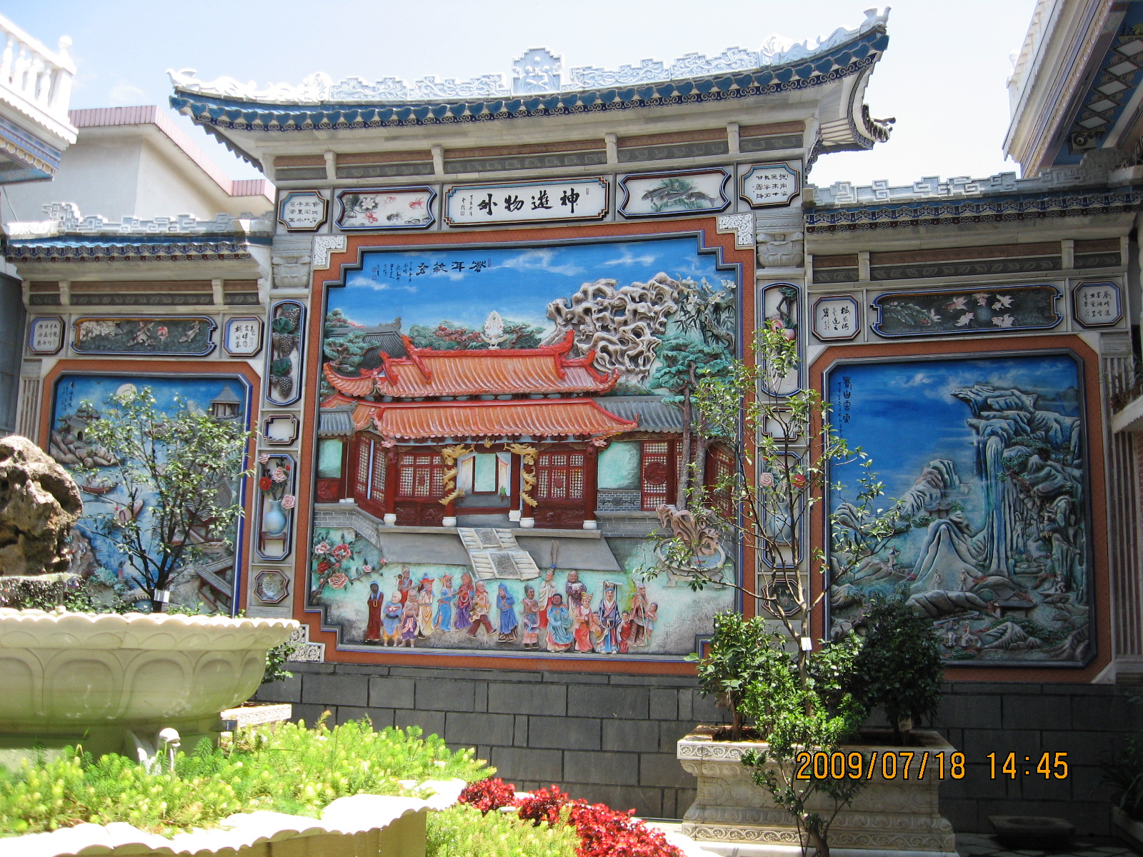 白墙青瓦,斗拱飞檐,水墨丹青,静洁儒雅的民居都是“三房一照壁”“四合五天井”的建筑结构。这是张家花园的一面墙壁,刻着各色人种来访的浮雕彩绘壁画。张家祖先与皇室有着渊源,这里曾是国宾馆,难怪有这样的大场面。