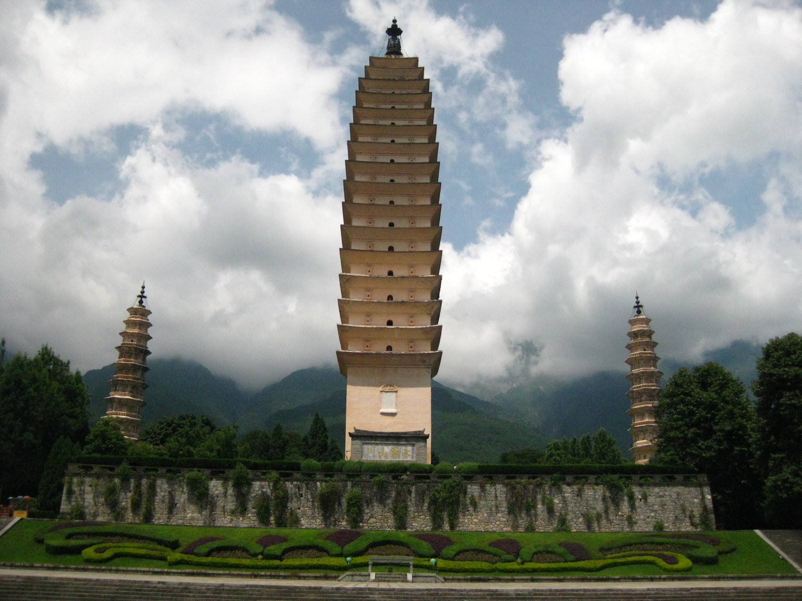 崇圣寺三塔是大理的标志,建于唐代,主塔叫“千寻塔”,形状似西安的大雁塔。千寻塔下面藏有经卷金佛等文物。两侧的小塔有些倾斜,那是1056年发生地震时造成的,斜度超过了比萨斜塔,但至今依然屹立。或许,这南中巨刹真有佛祖的护佑,愿它能世世代代享有安宁和平,妙香天下。