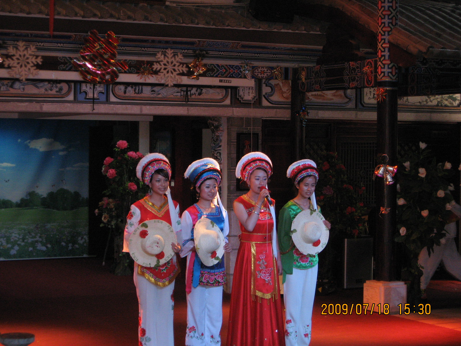 白族人崇尚白。服饰多为红白,蓝白相间,并且给自己的服饰以“风花月雪”的内涵。你看她们的帽子:飘垂的穗子是“下关风”;帽上的绣花是“上光花”,洁白的绒须是苍山雪,弯弯的造型是洱海月。白族人热爱自己的家园就像爱自己。