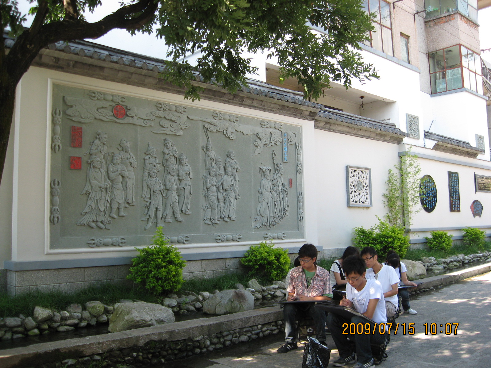 大理的民居非常有民族风格。这是古城内极普通的一户人家,整个外墙雕刻着一幅故事,还有诗词嵌于墙上,别的城市是见不到的。一群学生正在写生。秀美的山河,古朴的城堡,随处都可入画,只要你睁开双眼,张开心灵的门扉。