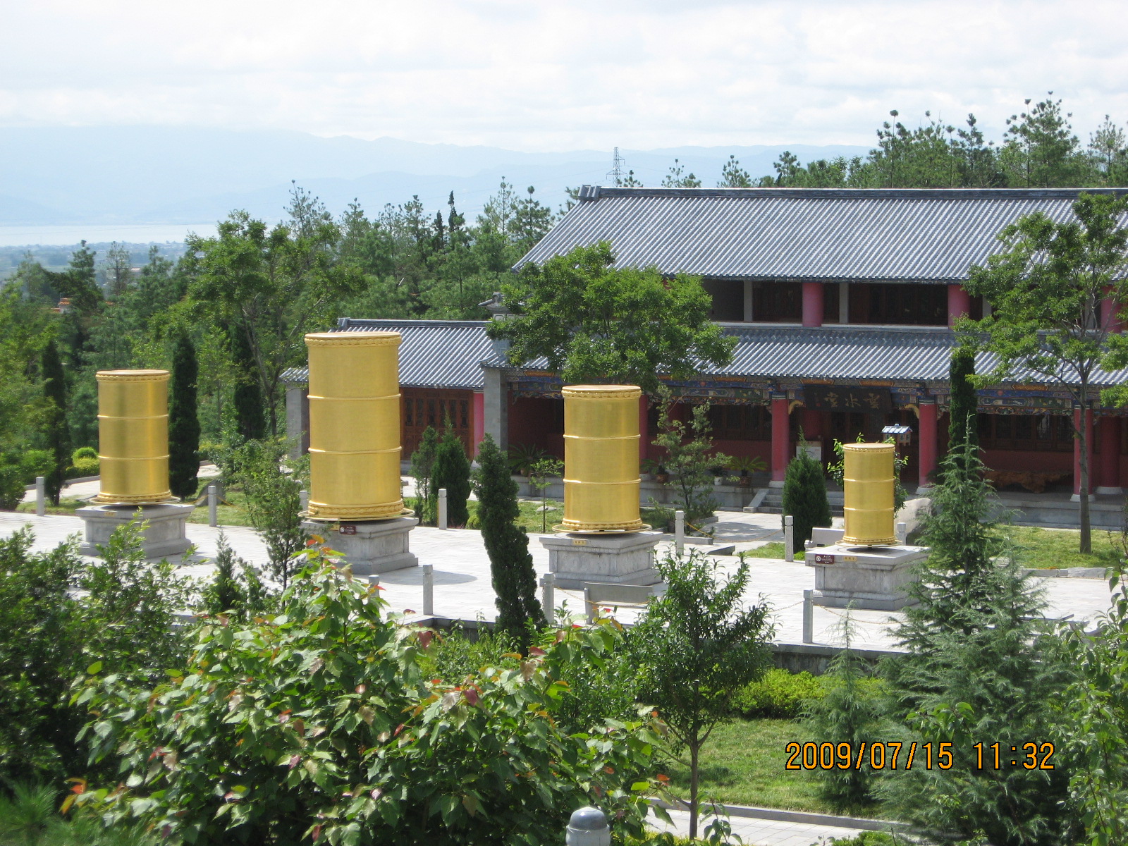 巨大的转经筒三人都抱不过来。这些法器贴的全是真金。2006年7月开光大典时,崇圣寺请来海内外高僧108人,红地毯从山门一直铺到最高处的大雄宝殿。场面宏大,气势非凡,再现了“灵鹫山圣地,妙香国佛都”的辉煌。