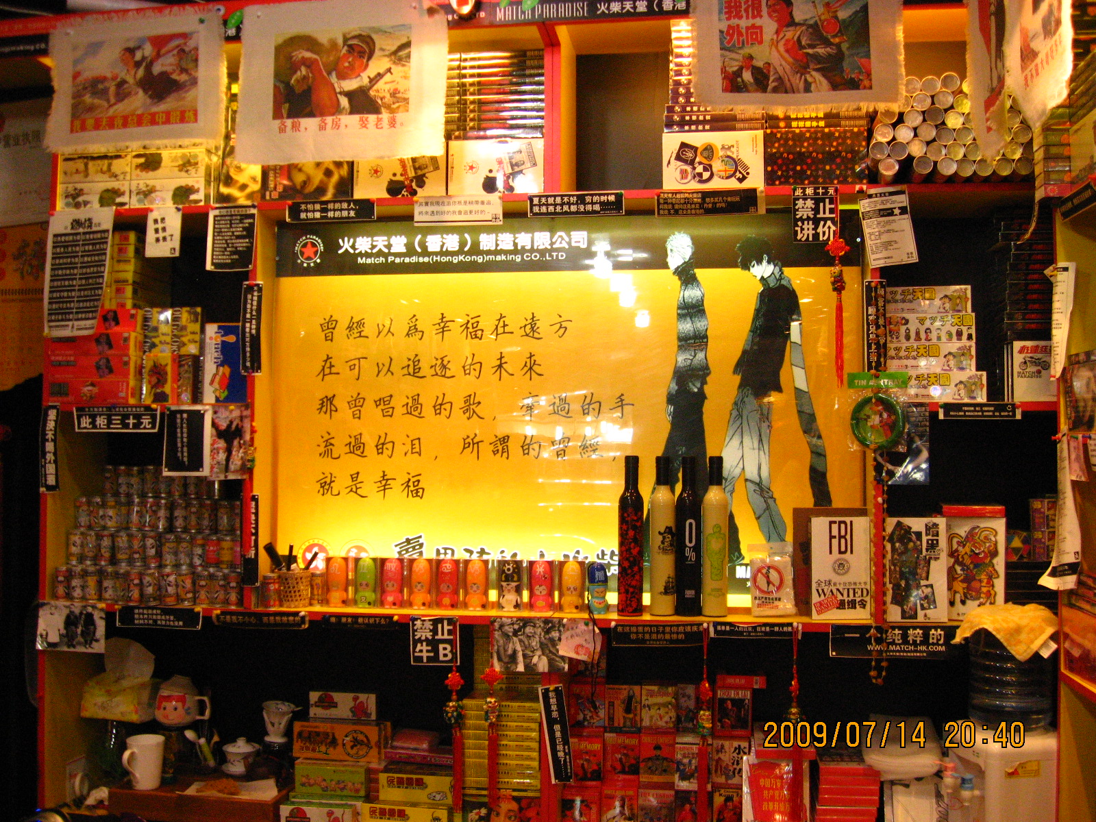 这是一家卖火柴的小店。现在谁还用火柴啊?这些各式各样的火柴包装见都没见过,价格还真不菲。或许是为了收藏?看见没?上面挂着文革时代的宣传画,中间海报边上写的啥?“禁止讲价”,“禁止牛B”。啥叫“牛B”?不懂。倒是这副海报吸引我。