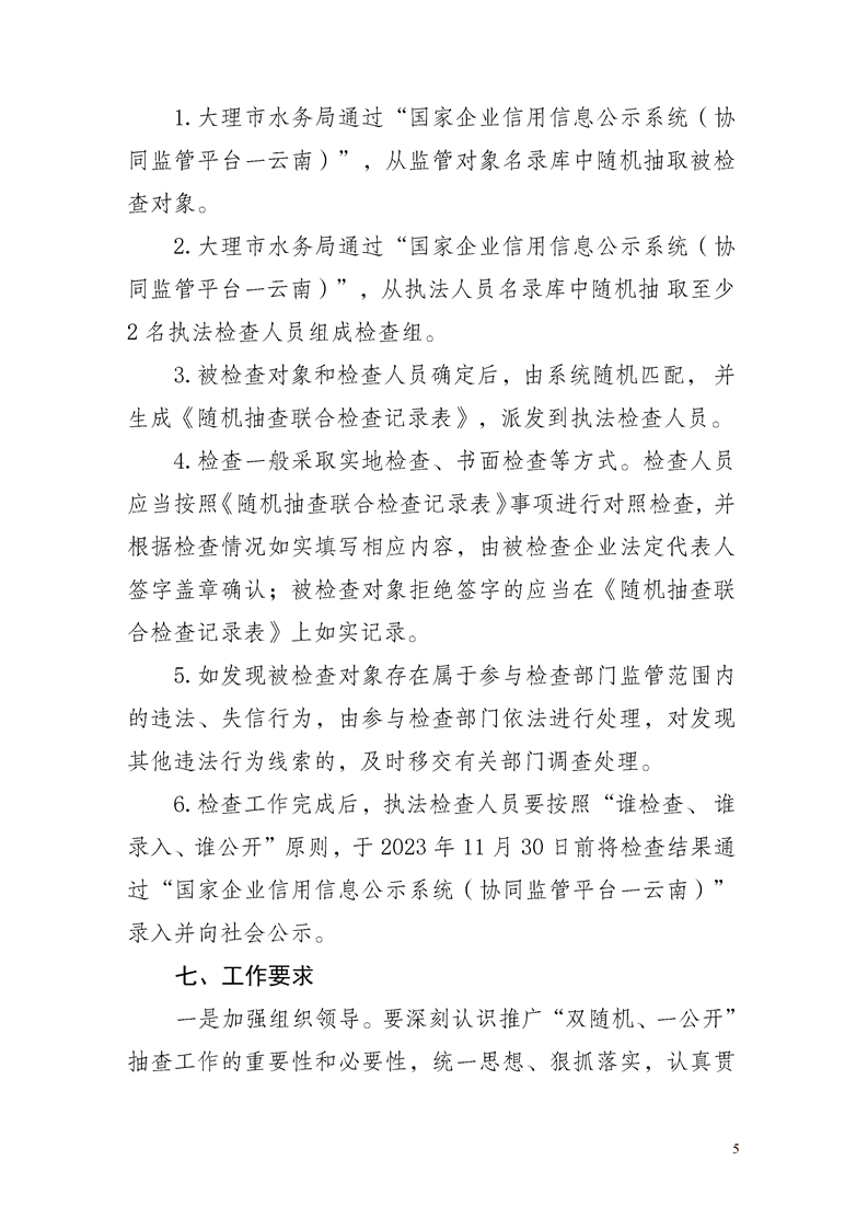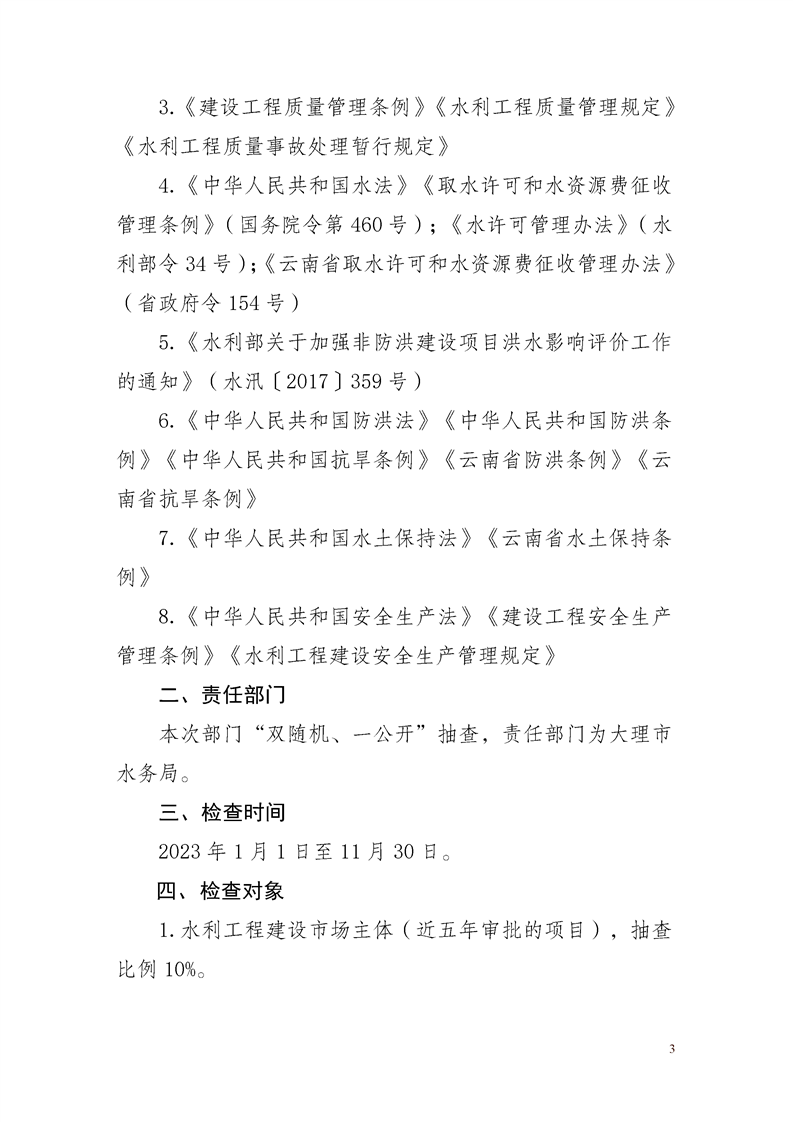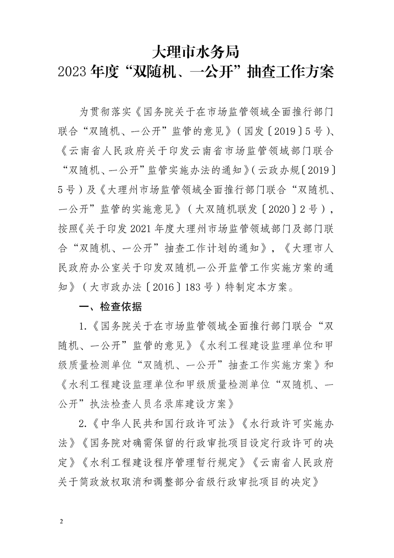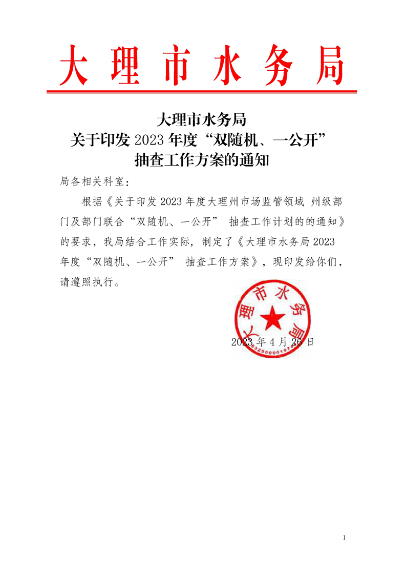 大理市水务局关于印发2023年度“双随机、一公开”抽查工作方案的通知