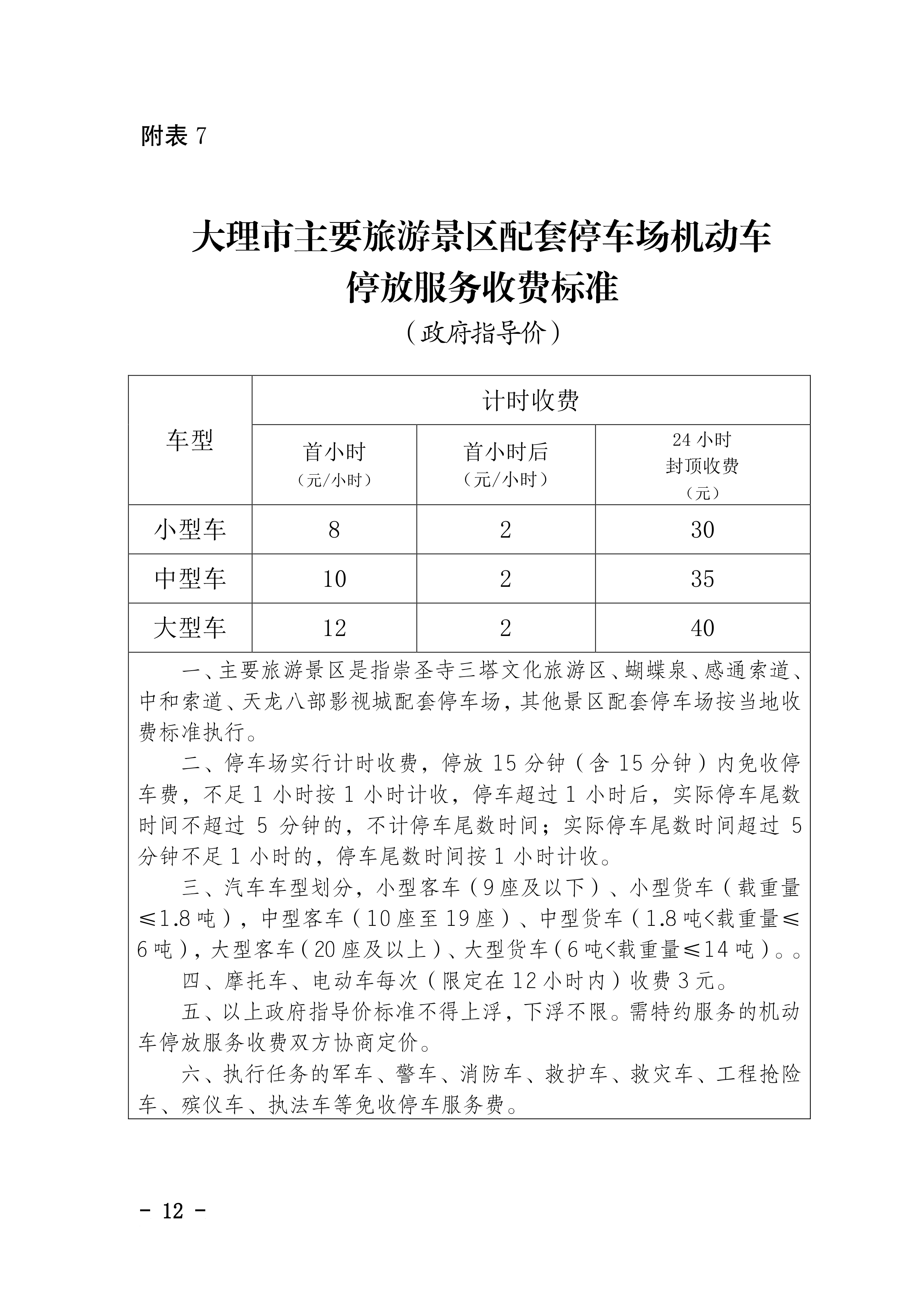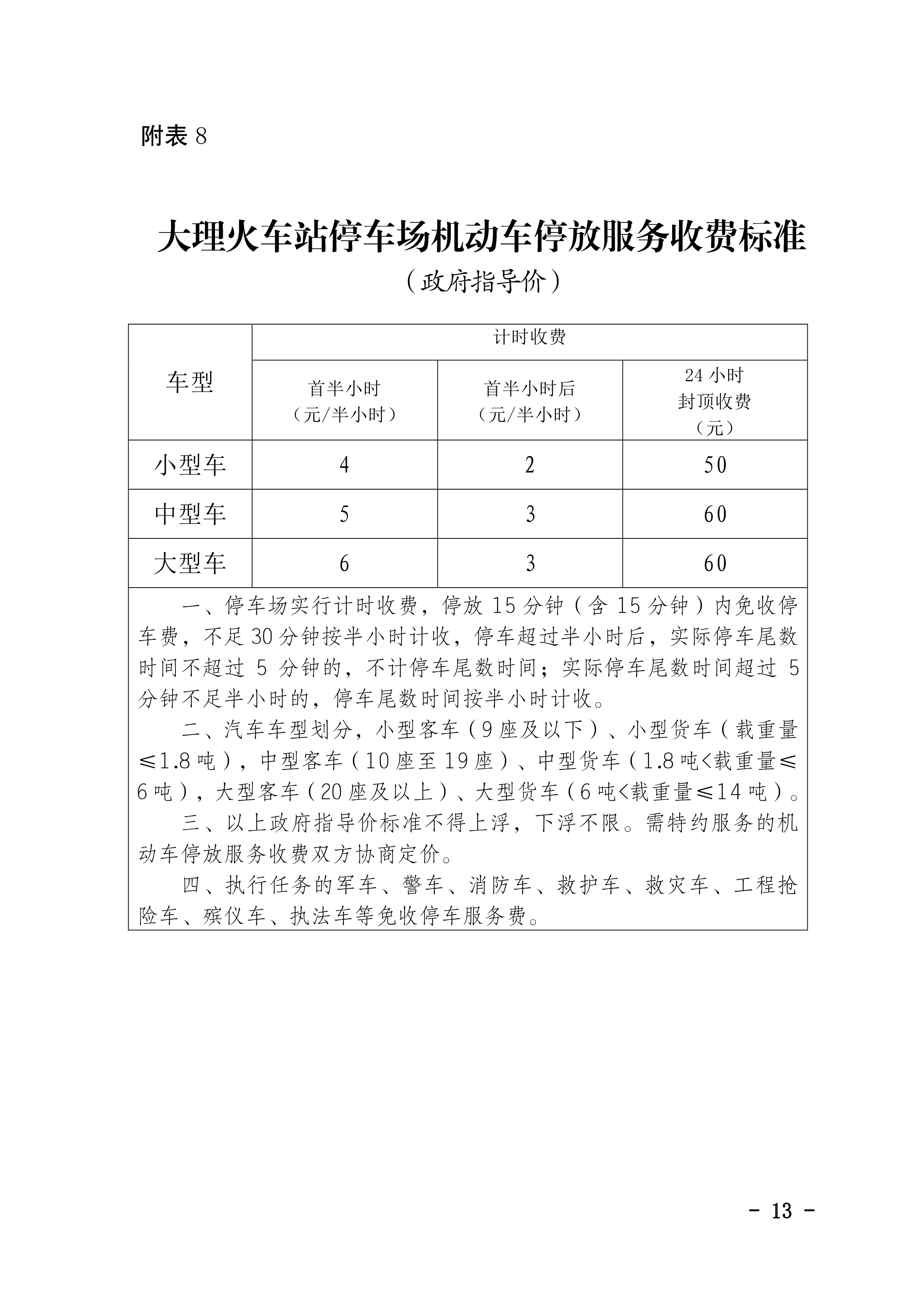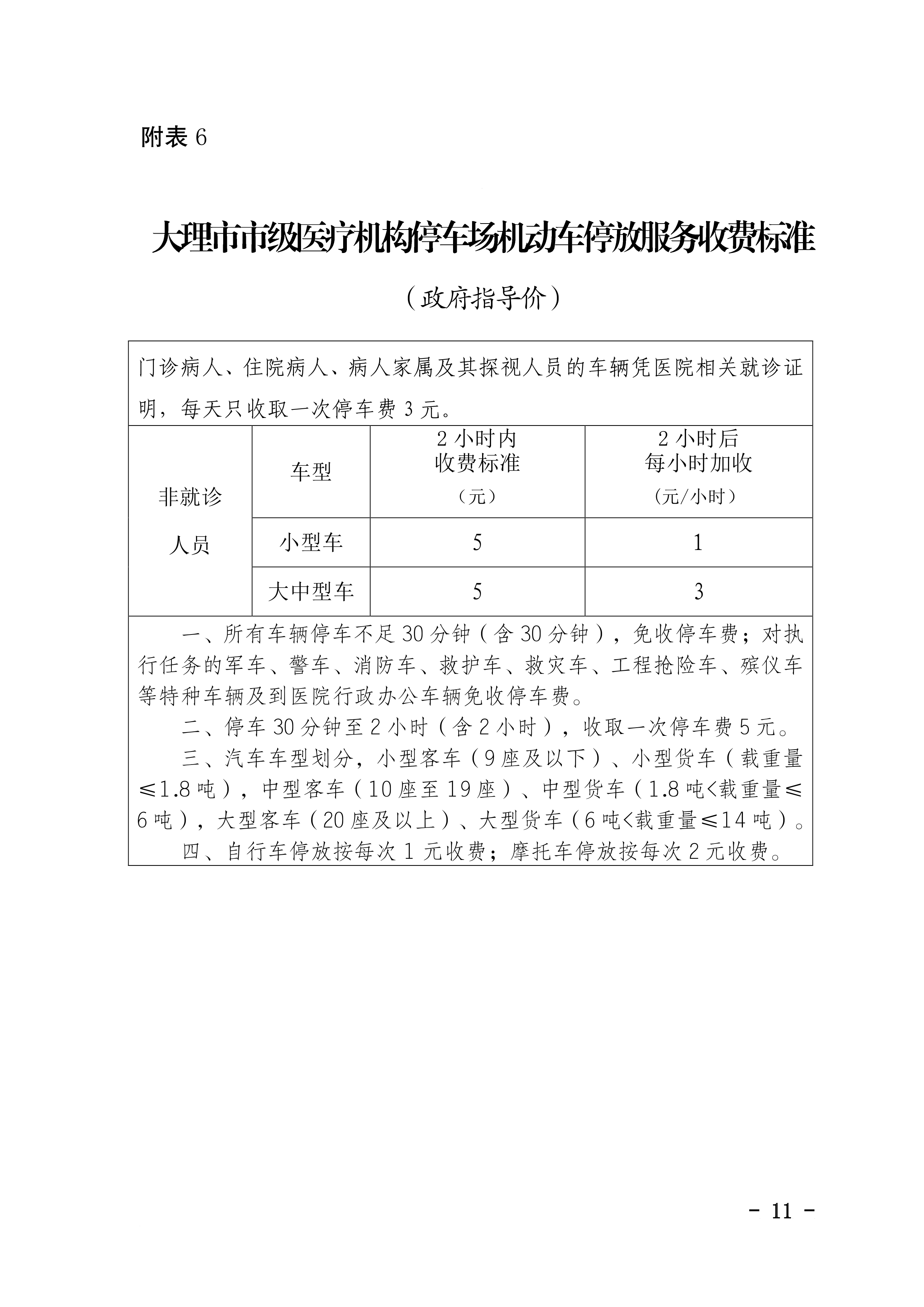 (四)市级医疗机构(详见附表6)、旅游景区配套停车场(详见附表7)、大理火车站停车场(详见附表8)机动车停放服务收费标准按原规定的标准执行,不作调整。