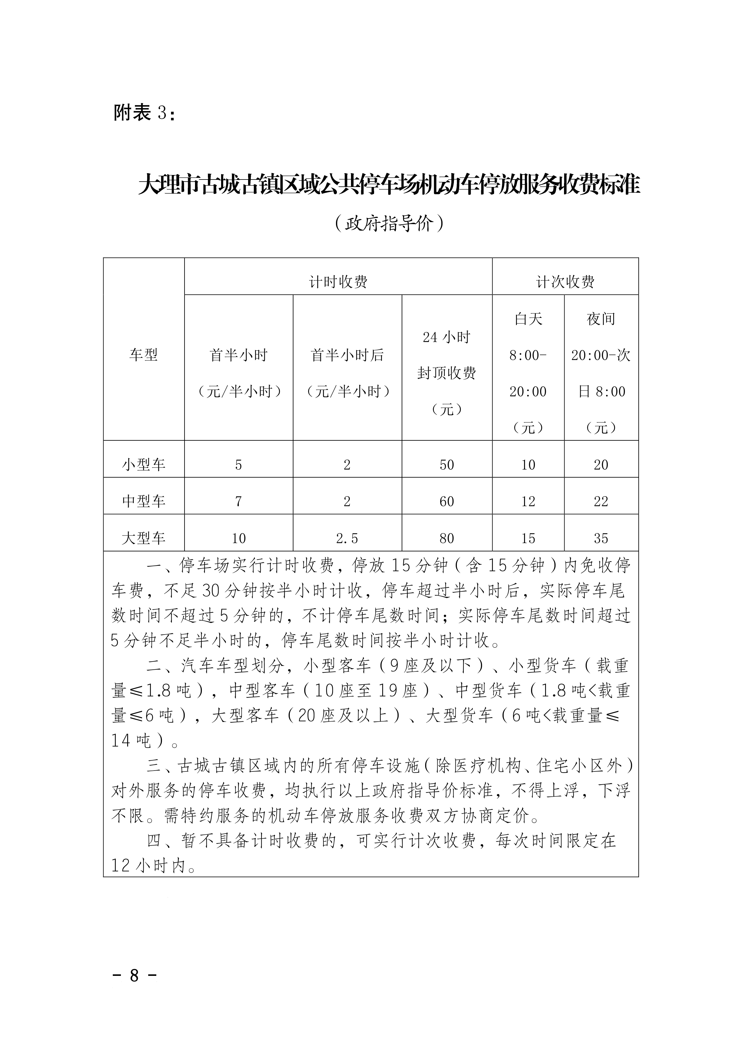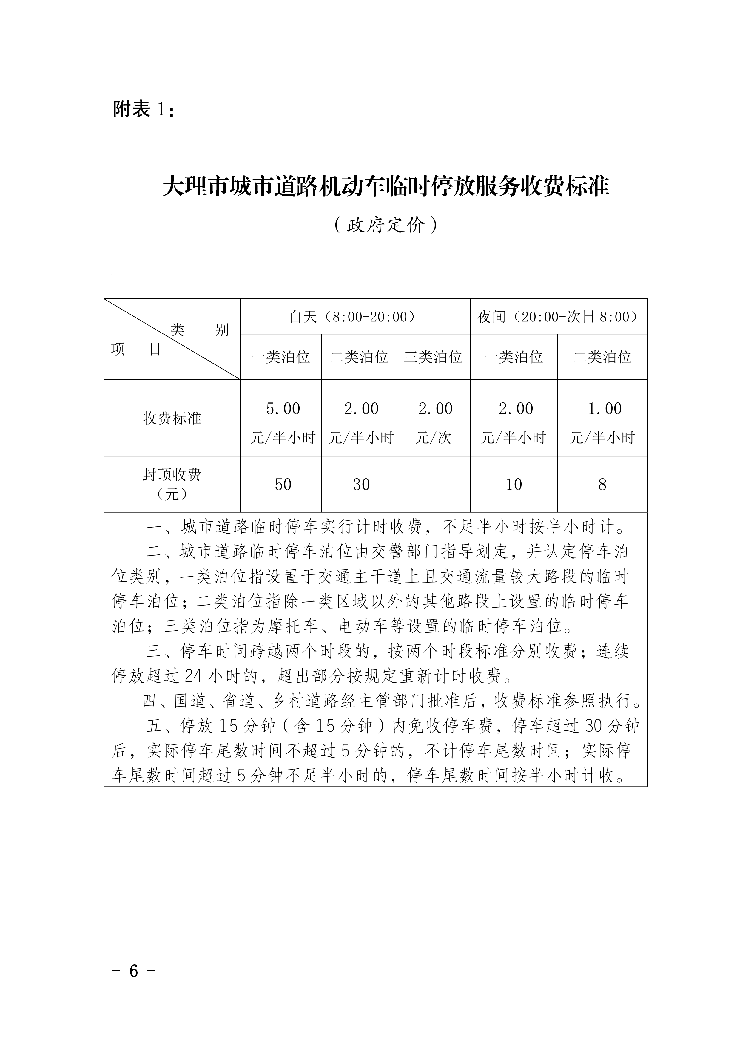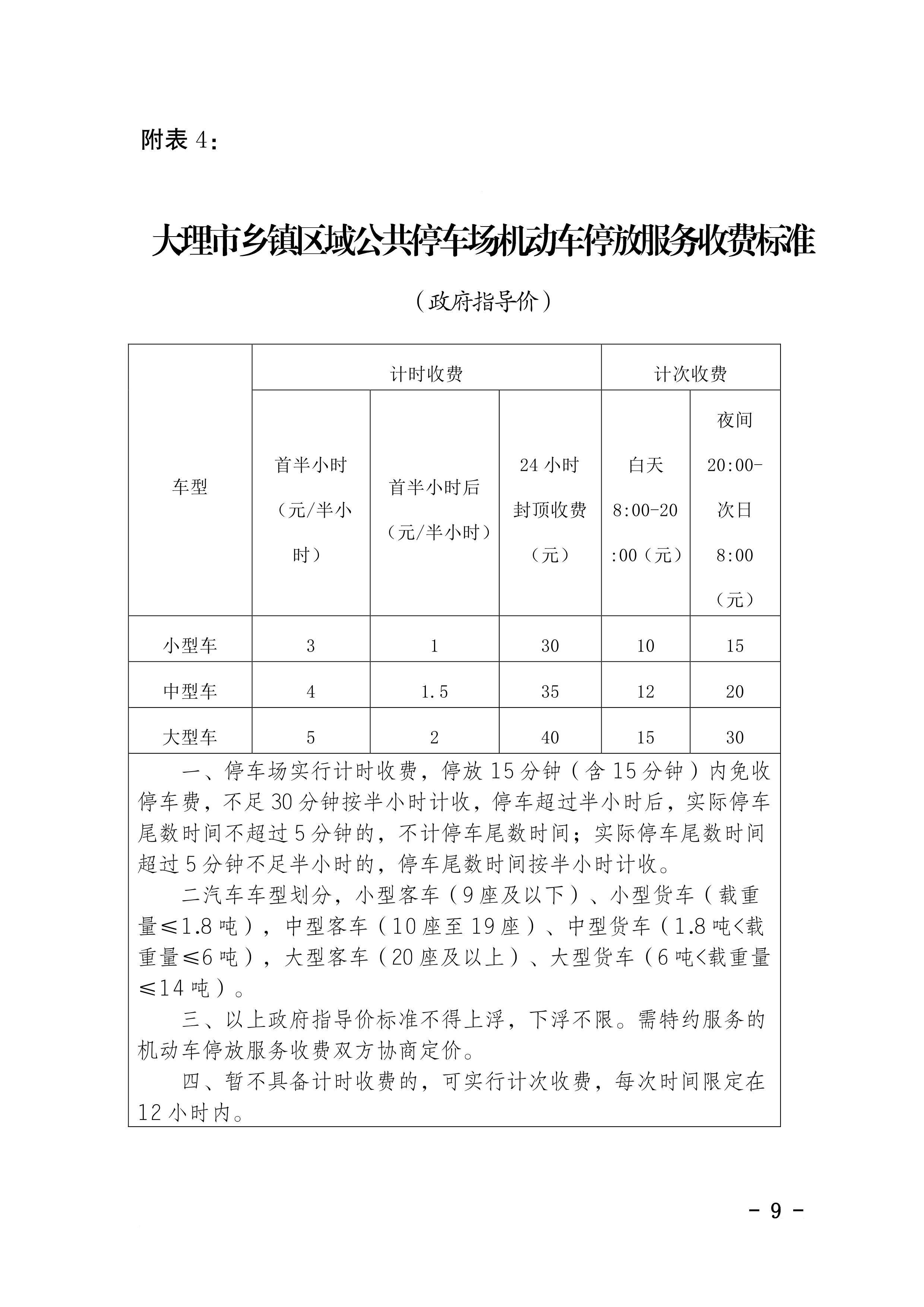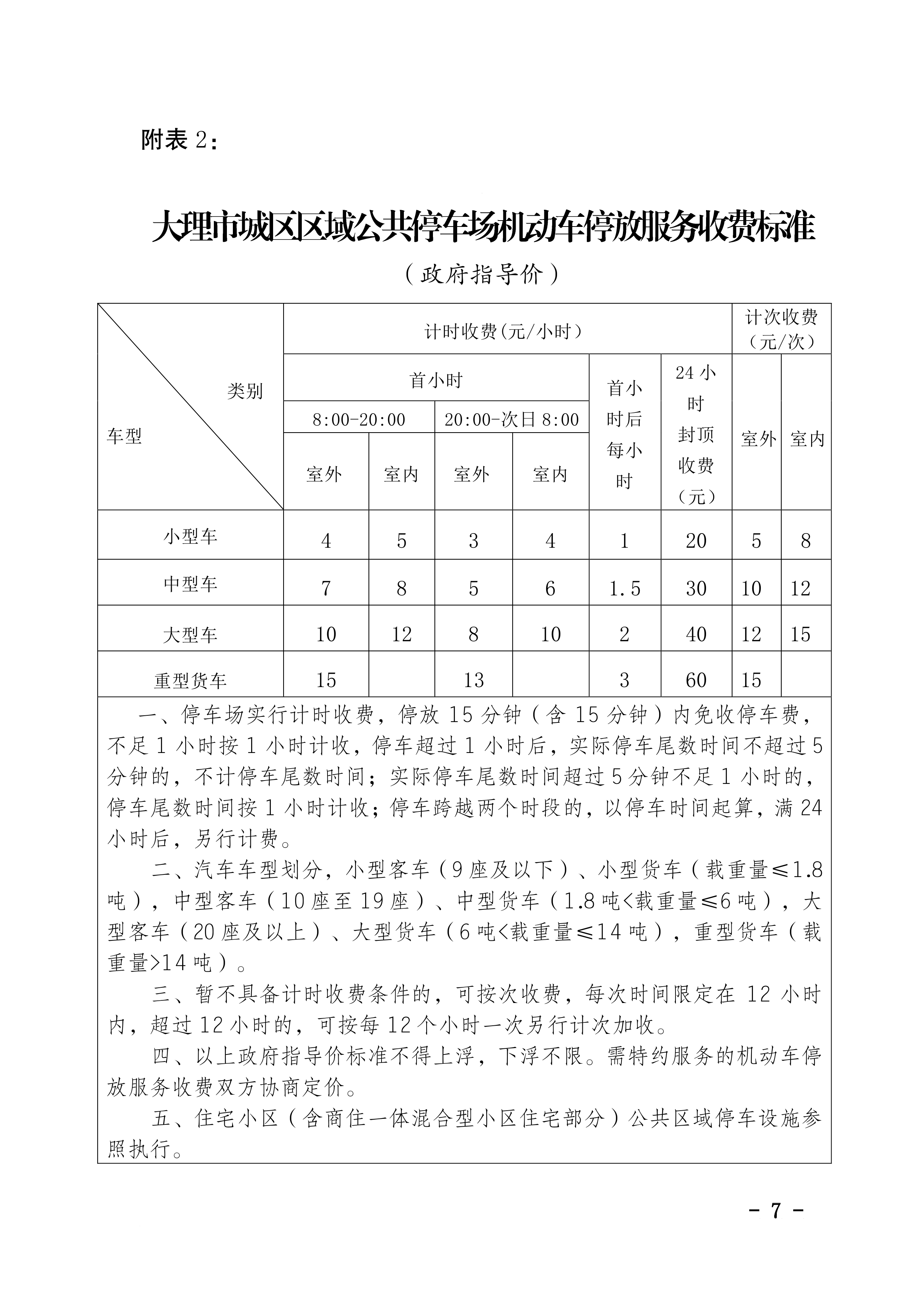 (二)大理市公共停车场机动车停放服务收费标准:实行政府指导价管理,将全市划分为城区区域、古城古镇区域、乡镇区域,依据不同区域停车资源、供需矛盾等情况,制定不同收费标准,经营者可下浮收费。(详见附表2、附表3、附表4)。
