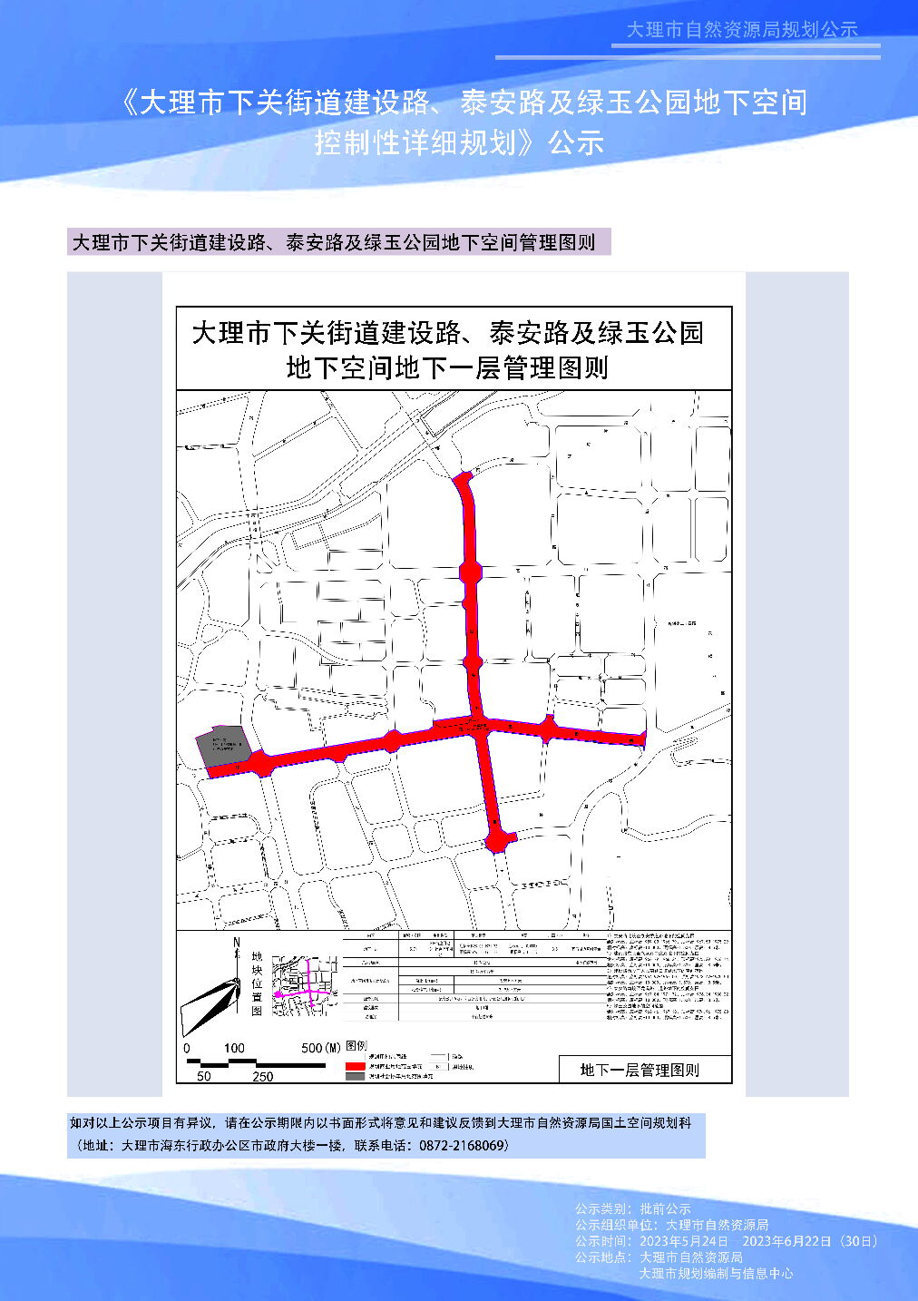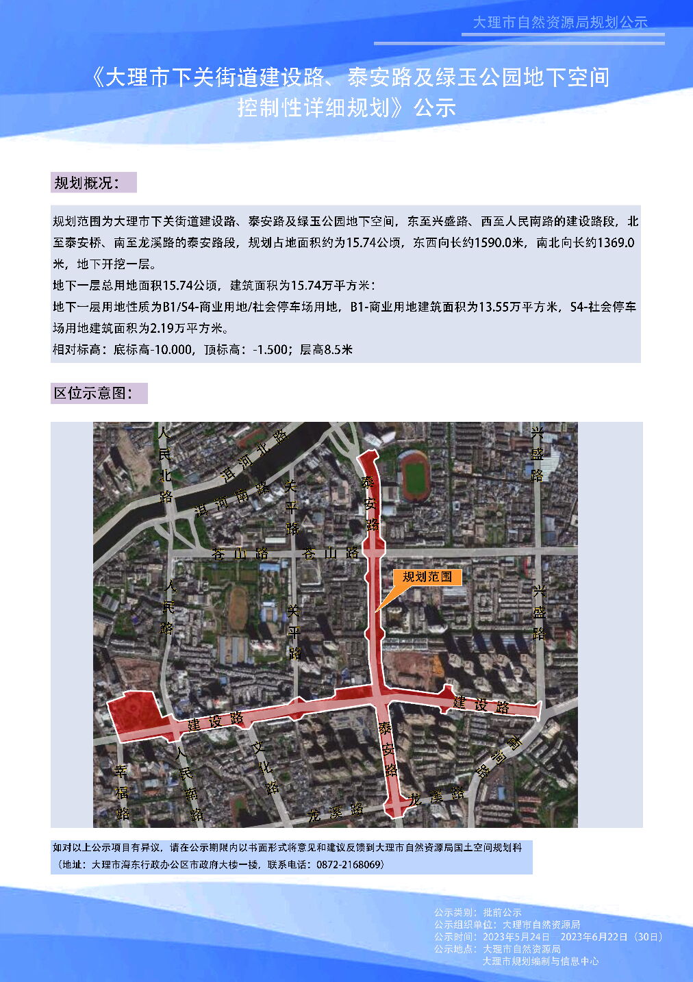为进一步整合大理下关片区地上、地下空间资源,有效改善该片区交通功能,指导下关片区泰安路、建设路及绿玉公园地下空间项目的建设,统筹安排规划范围内的土地使用和各项建设,加强城市规划管理,特制定大理市下关街道建设路、泰安路及绿玉公园地下空间控制性详细规划。规划范围为大理市下关街道建设路、泰安路及绿玉公园地下空间,东至兴盛路、西至人民南路的建设路段,北至泰安桥、南至龙溪路的泰安路段,规划占地面积约为15.74公顷,东西向长约1590.0米,南北向长约1369.0米,地下开挖一层。地下一层总用地面积15.74公顷,建筑面积为15.74万平方米;地下一层用地性质为B1/S4-商业用地/社会停车场用地,B1-商业用地建筑面积为13.55万平方米,S4-社会停车场用地建筑面积为2.19万平方米。相对标高:底标高-10.000,顶标高:-1.500;层高8.5米。