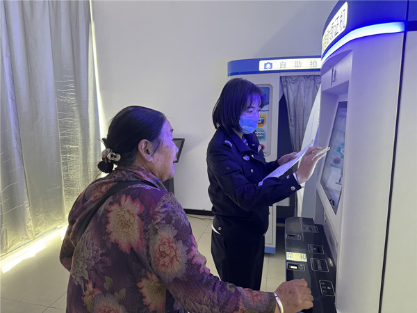 办好小伙的省外异地身份证,两位老人步履蹒跚地朝着窗口走来,唐娥一眼就认出了眼前的老妇人前两天刚办了身份证,今天应该是来取证的。不等他们开口,唐娥赶紧迎上去扶着老人问:“老人家,是不是来取身份证的,收到短信提醒没有?”老妇人答道:“我儿子说收着短信了,叫我来取。”唐娥引领着他们走进自助机取证处,耐心地指导老人进行指纹识别,取证成功后两位老人满意地离去。