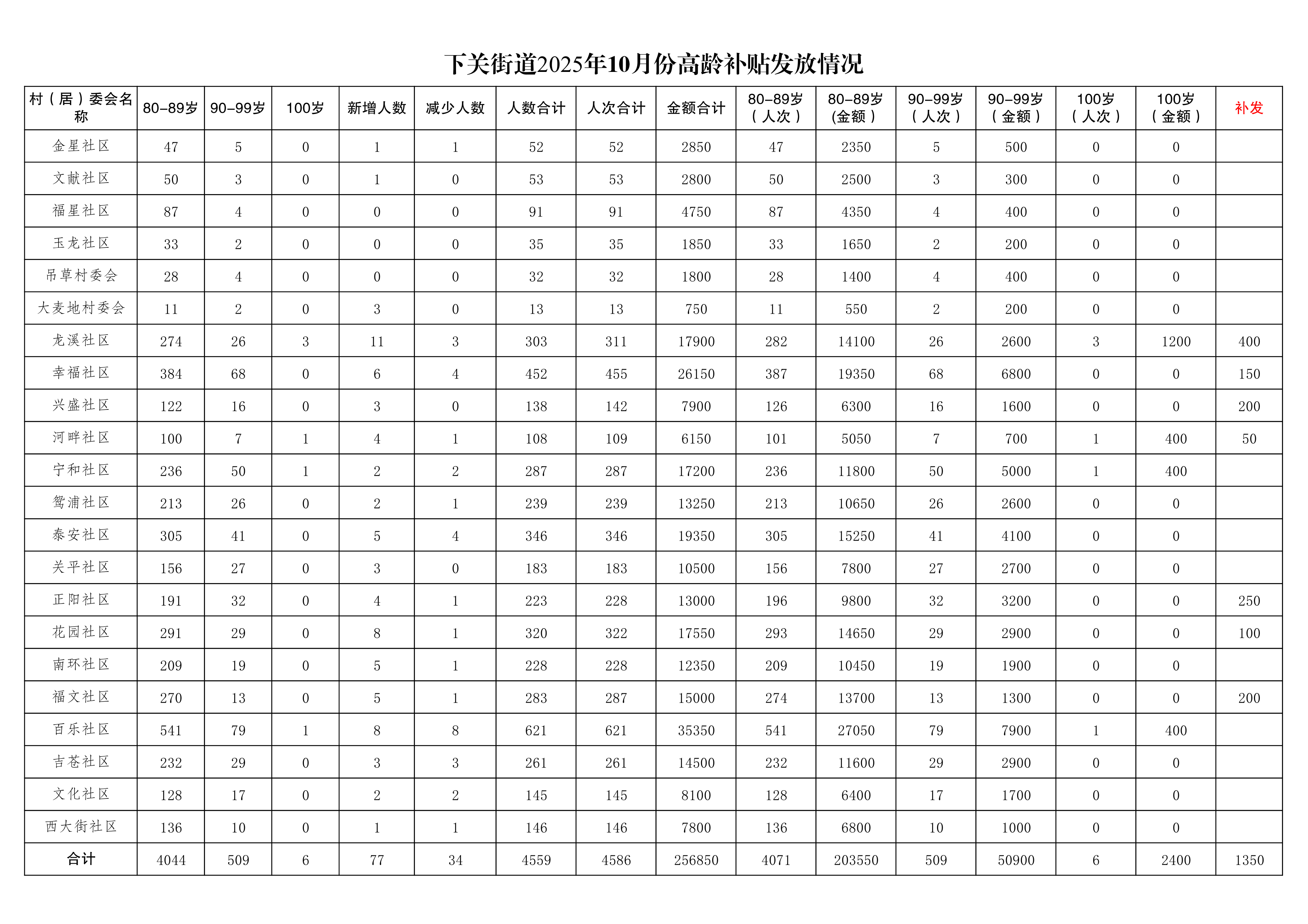 2025年10月,下关街道共发放高龄补贴256850元。其中,80-89岁共有4044人、发放高龄补贴4071人次、金额203550元(含补发1350元);90-99岁共有509人、发放高龄补贴509人次、金额50900元;100岁共有6人、发放高龄补贴6人次、金额2400元。