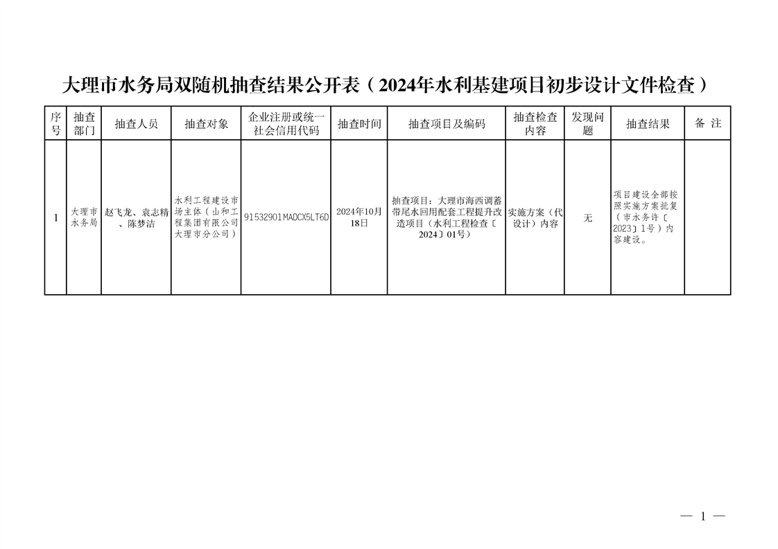 大理市水务局双随机抽查结果公开表(2024年水利基建项目初步设计文件检查)
