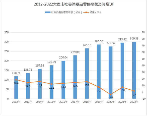 2022年,全市社会消费品零售总额完成300.39亿元,比上年增长1.7%。按销售单位所在地统计:城镇完成270.35亿元,比上年增长1.6%,乡村完成30.04亿元,比上年增长2.7%。按消费形态统计:餐饮收入完成44.78亿元,比上年增长8.2%;商品零售完成255.61亿元,比上年增长0.7%。从27个限上商品销售品类来看,石油及制品零售额完成67.08亿元,比上年增长10.2%;汽车类零售额完成66.65亿元,比上年增长1.6%;粮油、食品类零售额完成5.64亿元,比上年增长16.3%。