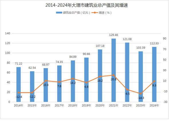 建筑业:全市全社会建筑业增加值完成31.81亿元,比上年下降11.5%。有资质等级的总承包和专业承包建筑业企业完成产值112.33亿元,比上年增长9.3%,企业营业收入82.87亿元。房屋建筑施工面积368.75万平方米,竣工面积65.03万平方米。