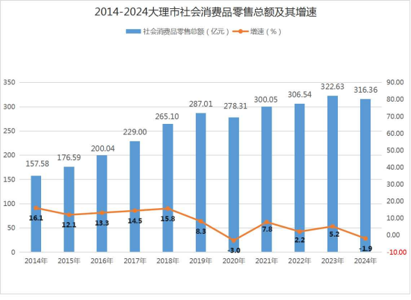 2024年,全市社会消费品零售总额完成316.36亿元,比上年下降1.9%。按销售单位所在地统计:城镇完成284.72亿元,比上年下降2.1%,乡村完成31.64亿元,比上年下降1%。按消费形态统计:餐饮收入完成52.66亿元,比上年增长8.1%;商品零售完成263.7亿元,比上年下降3.7%。限上商品零售类值中,石油及制品零售额完成76.11亿元,比上年增长1.7%;汽车类零售额完成55.99亿元,比上年下降16.2%;粮油、食品类零售额完成6亿元,比上年下降9.3%。