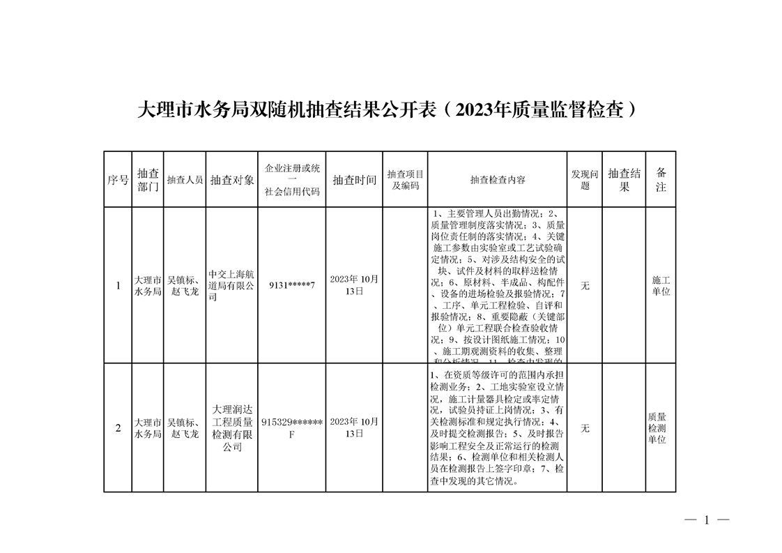 大理市水务局双随机抽查结果公开表(2023年质量监督检查)