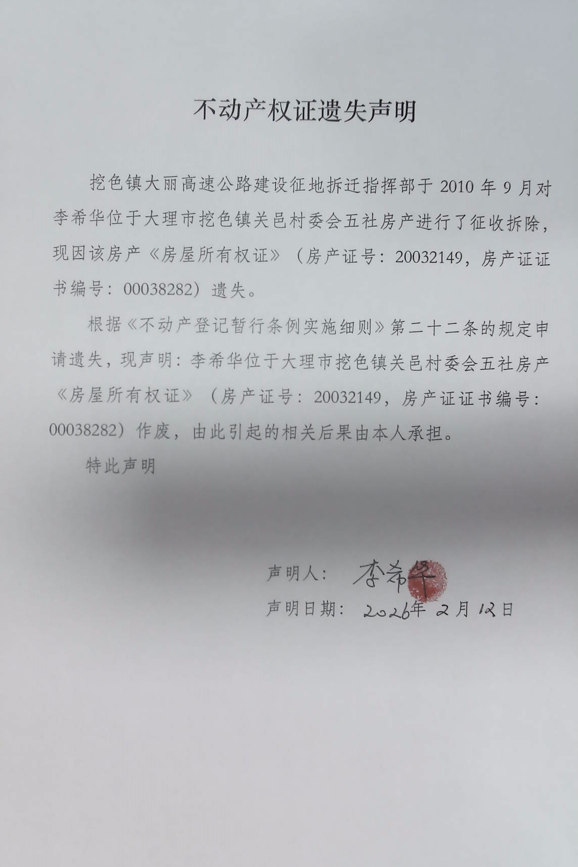不动产权证遗失声明