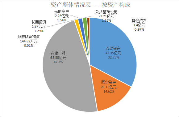 1. 按资产构成来看:流动资产47.35亿元,占资产总额32.75%;固定资产21.13亿元,占资产总额14.62%;在建工程68.38亿元,占资产总额47.3%;长期投资1.87亿元,占资产总额1.29%;无形资产2.23亿元,占资产总额1.54%;公共基础设施2.21亿元,占资产总额1.53%;政府储备物资144.82万元,占资产总额0.01%;其他资产1.4亿元,占资产总额0.97%。(参见图四)