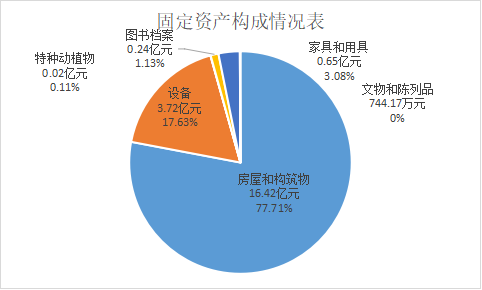 2.固定资产构成情况:房屋和构筑物16.42亿元,占固定资产的77.71%(其中,房屋15.26亿元,占72.21%);设备3.72亿元,占17.63%(其中,车辆2,920.34万元,占1.38%,单价100万(含)以上(不含车辆)设备1.27亿元,占6.01%);文物和陈列品744.17万元,占0.35%;图书档案0.24元,占1.13%;家具和用具0.65亿元,占3.08%;特种动植物0.02亿元,占0.11%。(参见图五)