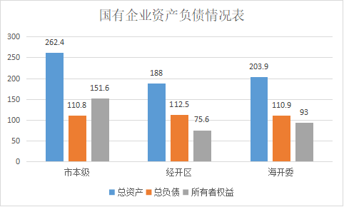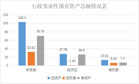 截至2022年底,全市行政事业性国有资产总额(账面净值,下同)144.59亿元,其中:市本级103.3亿元、经开区27.78亿元、海开委13.51亿元;负债总额40.34亿元,其中:市本级32.52亿元、经开区1.41亿元、海开委6.41亿元;净资产104.25亿元,其中:市本级70.75亿元、经开区26.4亿元、海开委7.1亿元。(参见图三)