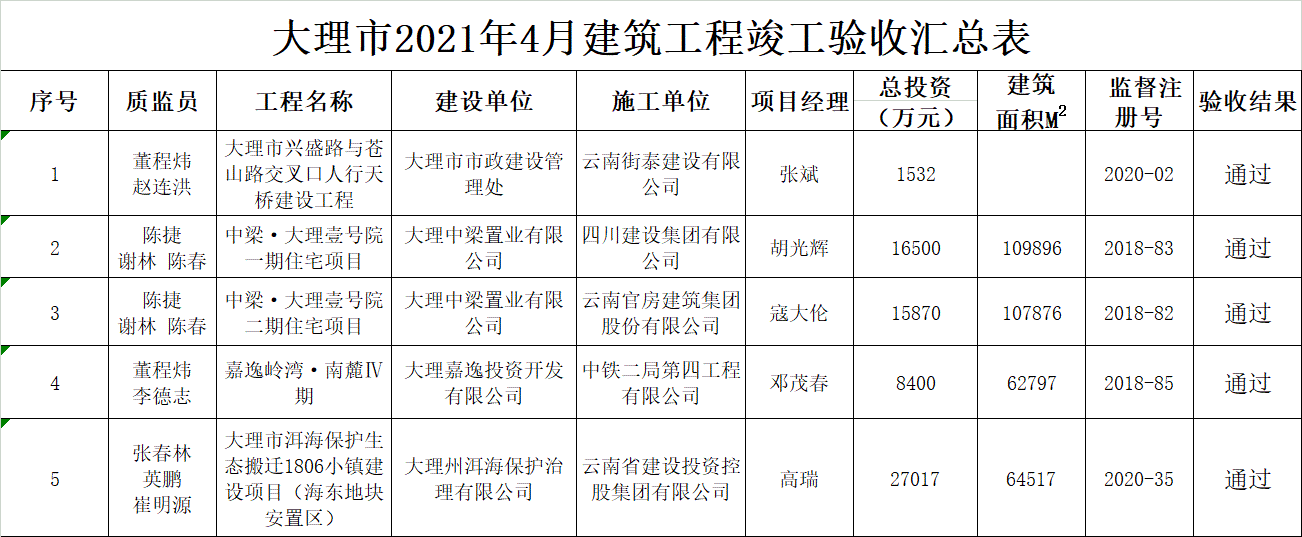 依据《房屋建筑及市政基础设施工程质量监督管理规定》(住房和城乡建设部第5号令)、《中华人民共和国建筑法》、《建设工程质量管理条例》和本省工程质量监督管理的有关规定,我局建筑工程质量监督站对以下5个项目受理了验收审核,现将2021年4月建筑工程竣工验收结果公示如下: