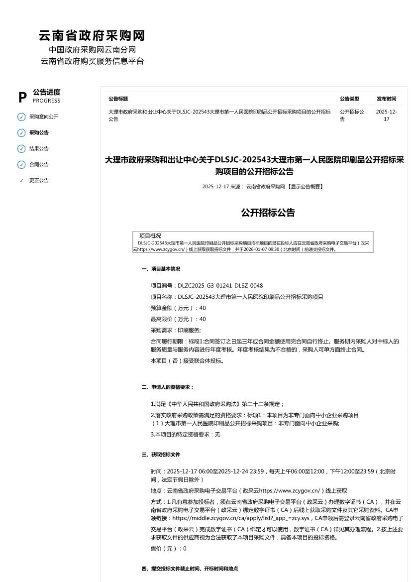 大理市第一人民医院印刷品公开招标采购项目的公开招标公告