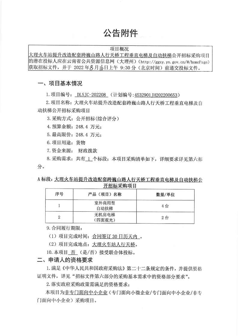 大理火车站提升改造配套跨巍山路人行天桥工程垂直电梯及自动扶梯公开招标采购项目招标公告