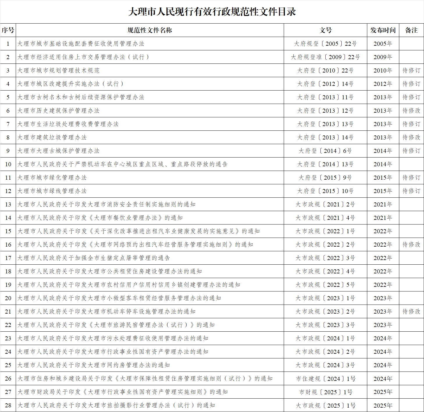 大理市人民政府现行有效行政规范性文件目录