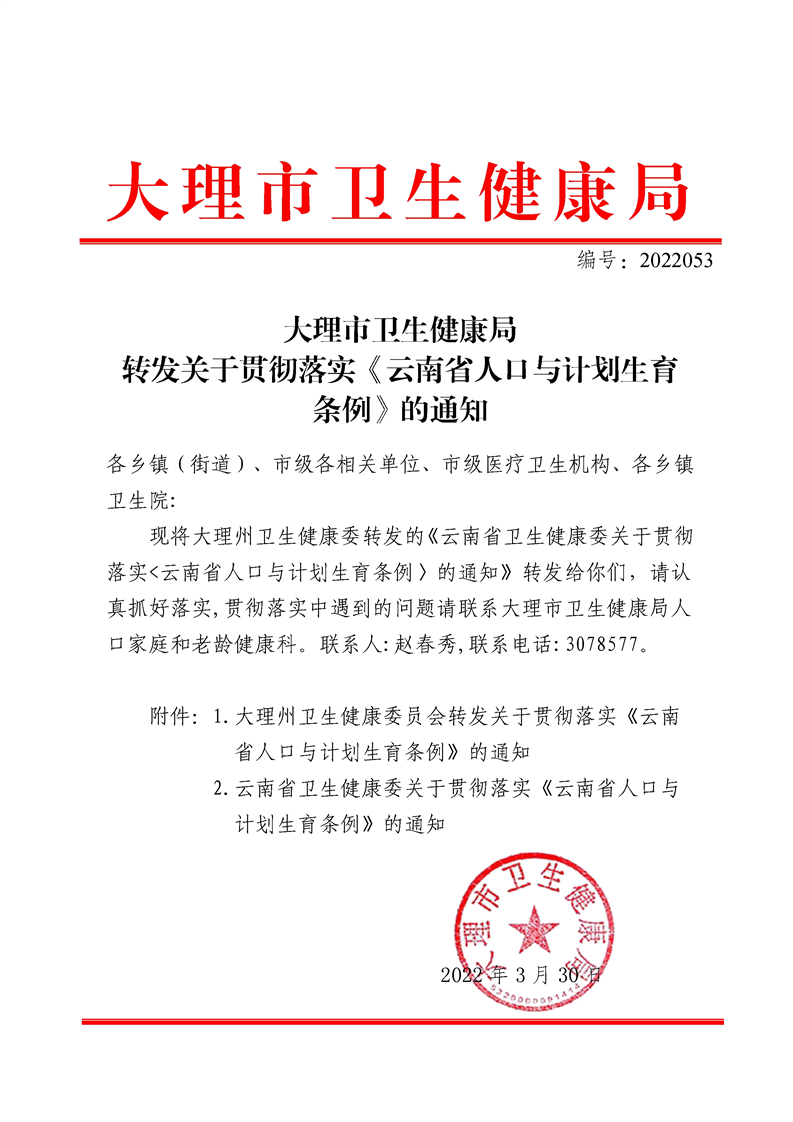 附件1: 大理州卫生健康委转发关于贯彻落实《云南省人口与计划生育条例》的通知